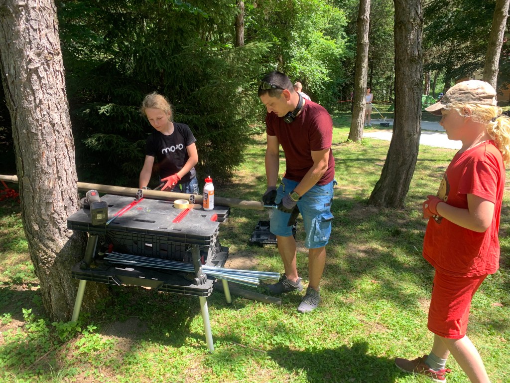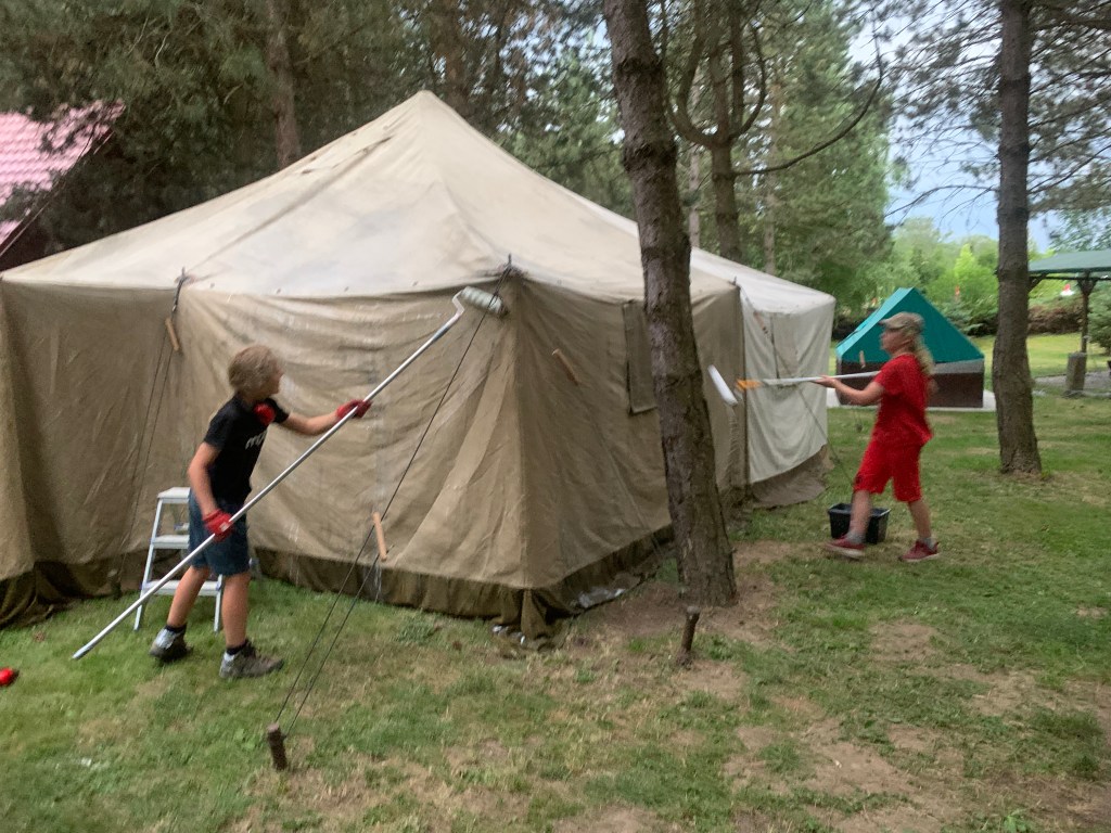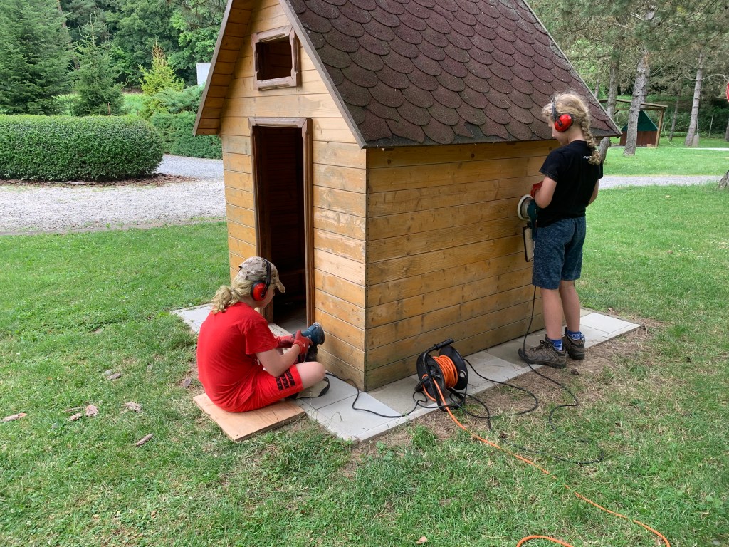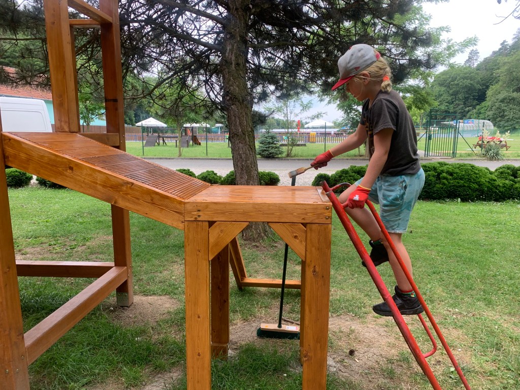 Nejmladší se hned pustil do natírání konstrukce na věž. Pečlivě, soustředěně a s takovou vervou, že bychom ho nejradši rovnou najali na celý nátěr tábora. Starší bratři zatím brousili dětský domeček – a nevypadalo to, že je to jenom práce. Byla to výzva. Bruska, prach, soustředění. Několik hodin v kuse. My víme, že v jejich věku to už hraničí s meditací.
