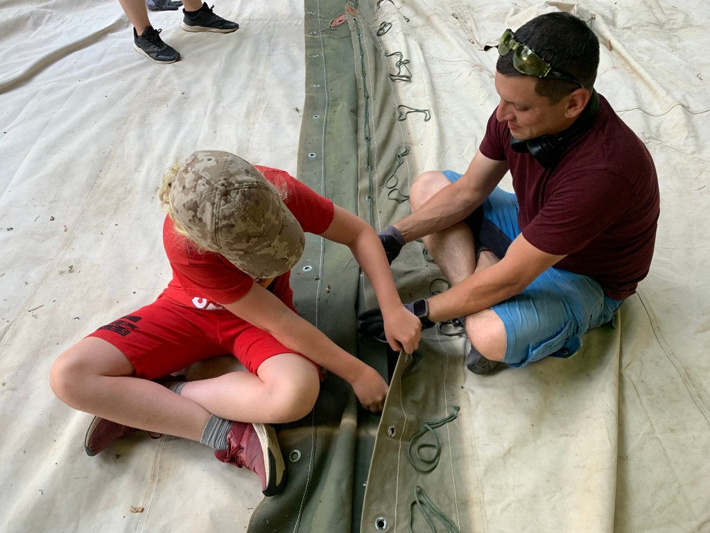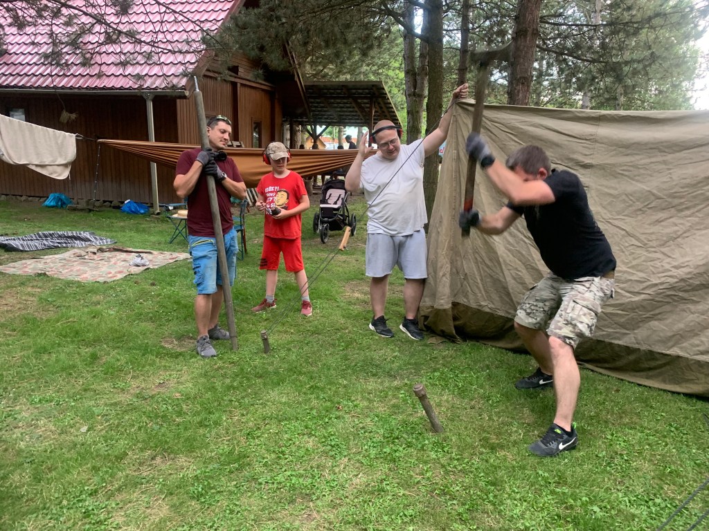 Když konečně dorazil náš mistr stanař, pronesl slavnou větu -„Tohle je za hodinu hotový.“ No… tak určitě. Reálně to trvalo o něco víc. Učili jsme se všichni – děti i dospělí, jak se propojují jednotlivé segmenty. Když se konečně propojily tři, zjistili jsme, že se musí otočit. To už se smál i pes, co šel kolem.