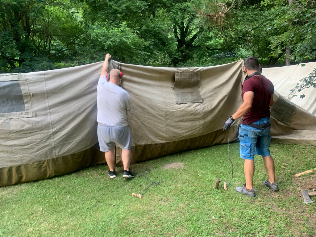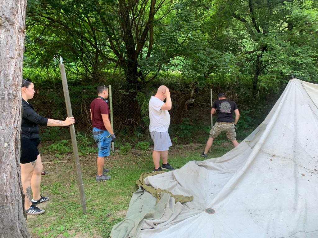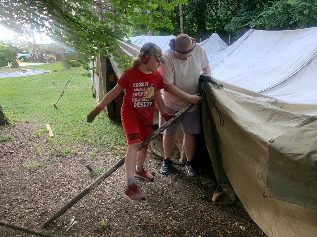 Cílem bylo mít stany hotové dřív, než v neděli večer přijdou bouřky. To znělo jako realistický plán – kdybychom se nezakecali.